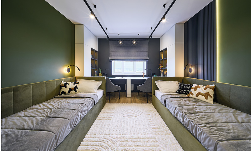 Далее мы попадаем в спальню для подростков, полностью отражающую их предпочтения и стиль жизни. Основная цветовая палитра – глубокие серые и зеленые оттенки, что делает интерьер современным и динамичным. У окна расположен большой рабочий стол, рассчитанный на двух детей. Он оснащен индивидуальными стеллажами для удобного хранения учебных материалов, книг и личных вещей каждого из подростков. Две кровати с качественными матрасами расположены так, чтобы обеспечить комфортный отдых и личное пространство. Шкаф разделен на две части, чтобы удобно организовать гардероб каждого ребенка.
