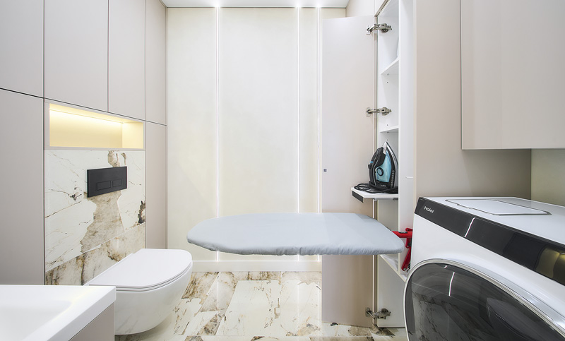 Завершает дизайн большое зеркало с подсветкой, оно не только визуально расширяет помещение, но и создает приятное освещение для ежедневных процедур. Такой подход делает постирочную не только функциональной, но и уютной зоной, где приятно проводить время. На полу также положили итальянский керамогранит от Lucido.