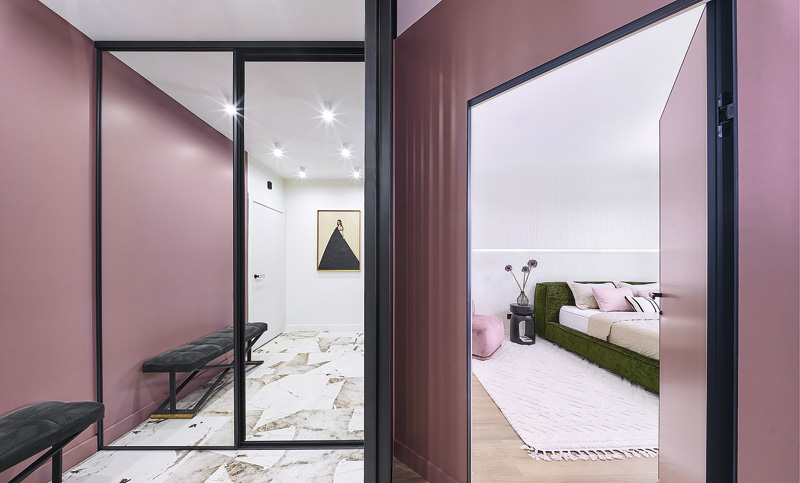 Особое внимание уделено дверям от Sofia – инвизибл-двери под покраску идут с алюминиевыми черными торцами для защиты. Мы покрасили их в цвет стен, чтобы частично скрыть двери и добиться эффекта «невидимых» входных конструкций. Такой подход делает интерьер более лаконичным и современным, создавая ощущение целостности пространства.