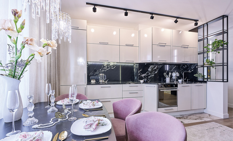 Кухонный гарнитур остался без изменений, мы лишь вписали новое пространство вокруг него. В гостиной поменяли обеденную группу, а также цвет стен и напольное покрытие, тем самым вписав существующую кухню в новый интерьер, который получился очень воздушным и интересным.