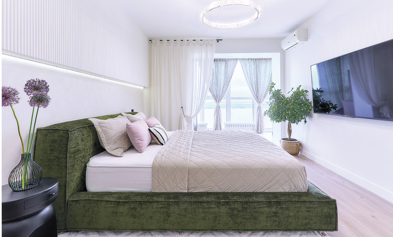 В этом проекте мы создали уютную спальню, выполненную в нежных пастельных тонах, которая одновременно выглядит свежо и стильно. Основная палитра включает мягкие оттенки, а яркие цветовые акценты добавляют комнате индивидуальности и динамики. Кровать выполнена в насыщенном травянистом зеленом цвете, что создает спокойную и природную атмосферу. Плюс к этому кресло пудрово-розового оттенка служит ярким акцентом и добавляет комнате мягкости и уюта. На стенах использована краска Little Green, отлично сочетающаяся с декоративной штукатуркой от A-Studio и стеновыми панелями с плинтусом от «Ампир Декор» – все эти материалы создают интересную текстурную игру и глубину интерьеру.