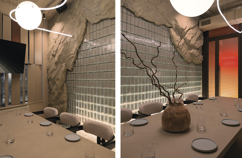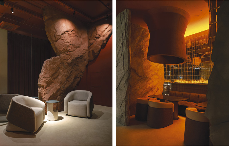 Фактурная штукатурка стен с выступающими объемами скал создает облик пещеры, где скрываются от изнуряющей жары и знойных ветров. Металлическая текстура стеновых панелей и наливной пол из микроцемента напоминают гладкие поверхности дюн. Теплая гамма повторяет оттенки горных пород местного ландшафта, которые меняются от марсианского красного до песочного.