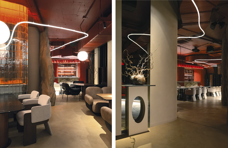 Органические формы и скругленные линии в планировке раскрывают как тему природы, так и кальянную культуру. Светодиодные ленты на потолке плавно перетекают по всему залу, словно извивающийся дым кальяна, символизируя непрерывность пути.
