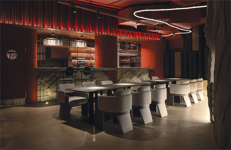 Доминантой общего зала служит барная зона, ее красный оттенок в сочетании с выразительными фактурами добавляет динамику плавным силуэтам. Большая часть мебели, наоборот, разработана в лаконичном стиле, что гармонично интегрирует ее в существующих контекст.