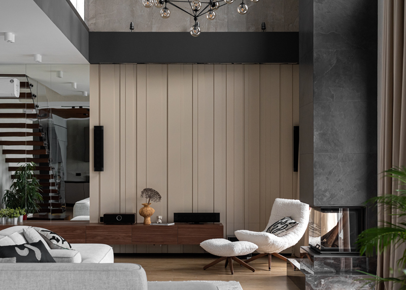 Дом в поселке «Лебяжья поляна» для лучезарной семьи именно таким характеристикам соответствует. В решении интерьера нет перегруза и нет излишней невесомости. Пространство геометрично, графично, лаконично, с нотками мягких сложных оттенков и уютных текстур.